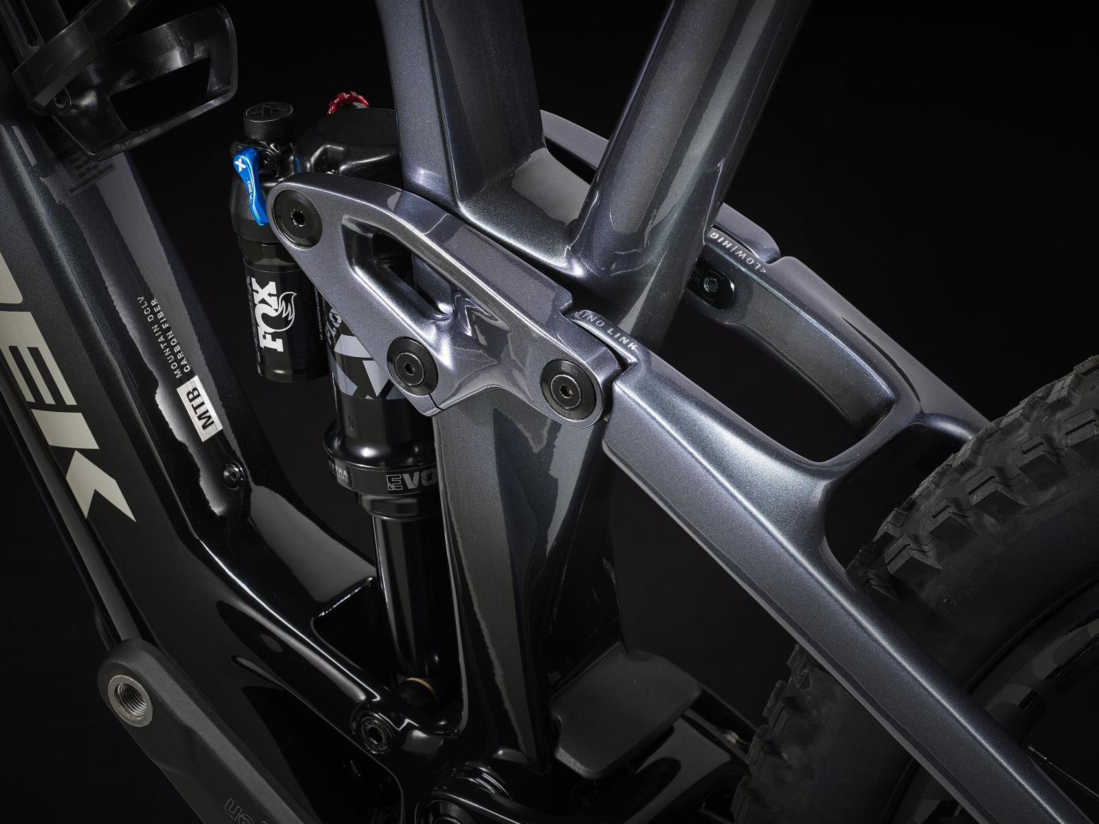 Rahmen: OCLV Mountain Carbon, herausnehmbarer Akku, interne Zugführung, Aluminiumumlenkhebel, 34,9 mm Sitzrohrdurchmesser, Aufnahme für obere Kettenführung, 55 mm Kettenlinie, Mino Link, ABP, Boost148, UDH, 140 mm Federweg