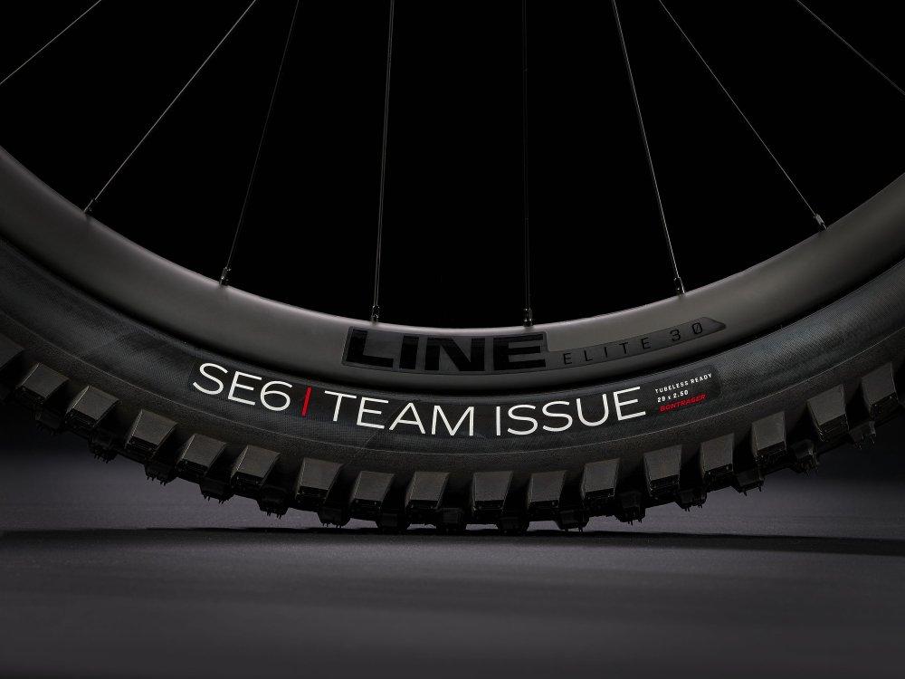 Reifen: Bontrager SE5 Team Issue, Tubeless Ready, Core Strength-Flankenschutz, Aramidwulstkern, 120 TPI, 29 x 2.50 // Bontrager SE6 Team Issue, Tubeless Ready, Core Strength-Flankenschutz, Aramidwulstkern, 120 TPI, 29 x 2.50