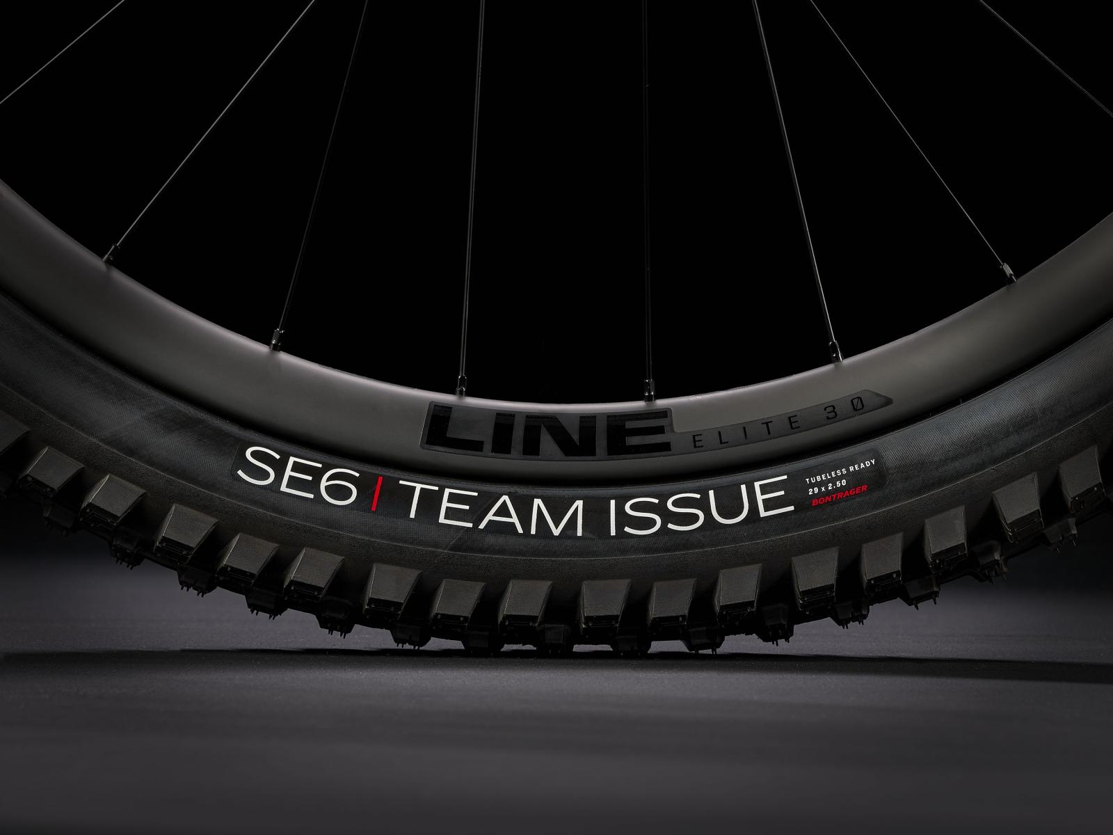 Reifen: Bontrager SE5 Team Issue, Tubeless Ready, Core Strength-Flankenschutz, Aramidwulstkern, 120 TPI, 29 x 2.50 // Bontrager SE6 Team Issue, Tubeless Ready, Core Strength-Flankenschutz, Aramidwulstkern, 120 TPI, 29 x 2.50