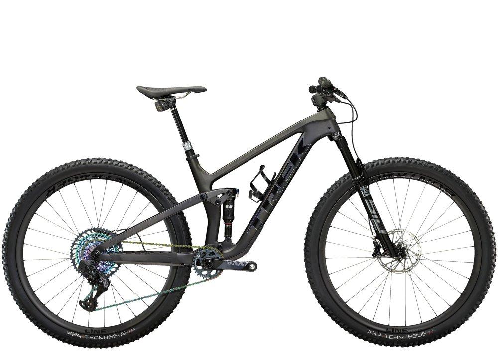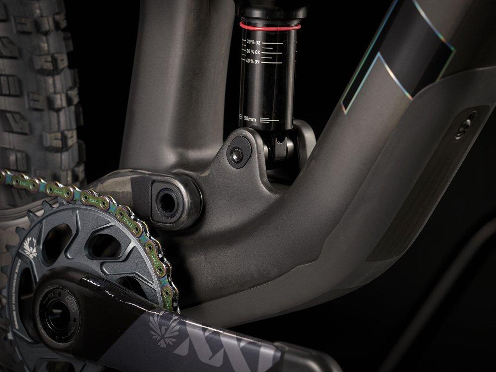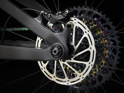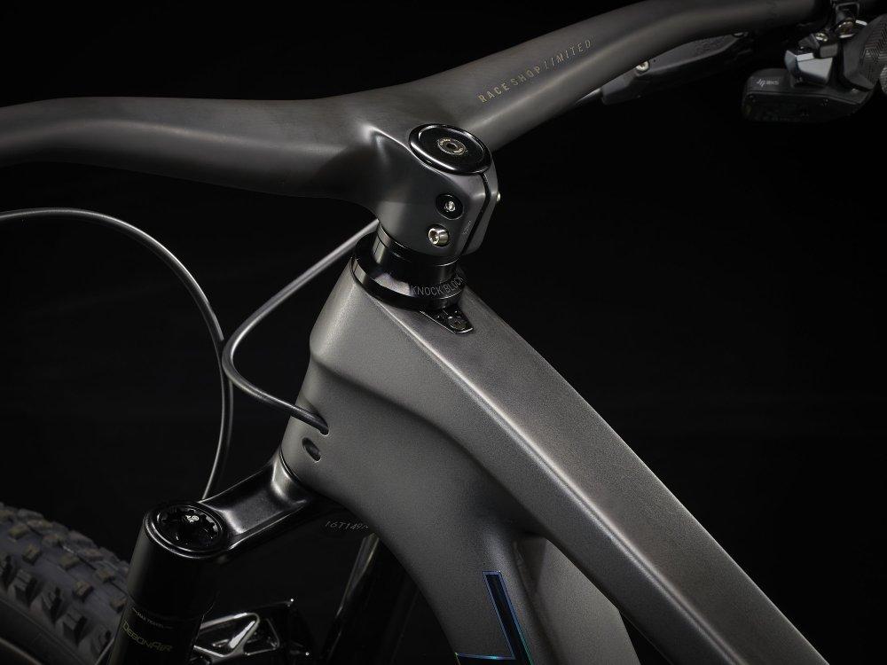 Einen Vollcarbonrahmen, eine extrem geschmeidig arbeitende RockShox SID Ultimate-Gabel mit 120 mm Federweg und Charger Race Day-Dämpfung mit vielen Anpassungsmöglichkeiten, einen RockShox Deluxe Ultimate RCT-Dämpfer mit 120 mm Federweg und einen komplett drahtlosen SRAM XX1 Eagle AXS-Antrieb. Dazu gibt es breite Bontrager Line Pro 30-Carbonlaufräder inklusive Rapid Drive-Nabe mit 108 Zähnen für einen verzögerungsfreien Kraftschluss, eine drahtlose RockShox Reverb AXS-Variosattelstütze und SRAM Level Ultimate-Scheibenbremsen mit Carbonbremshebeln.